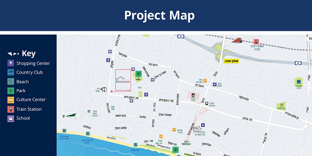 Shopping center – Beach – Cultural center – Country club – Park – Train station – School – Project map