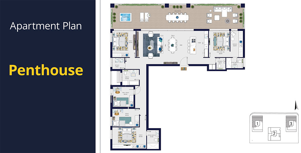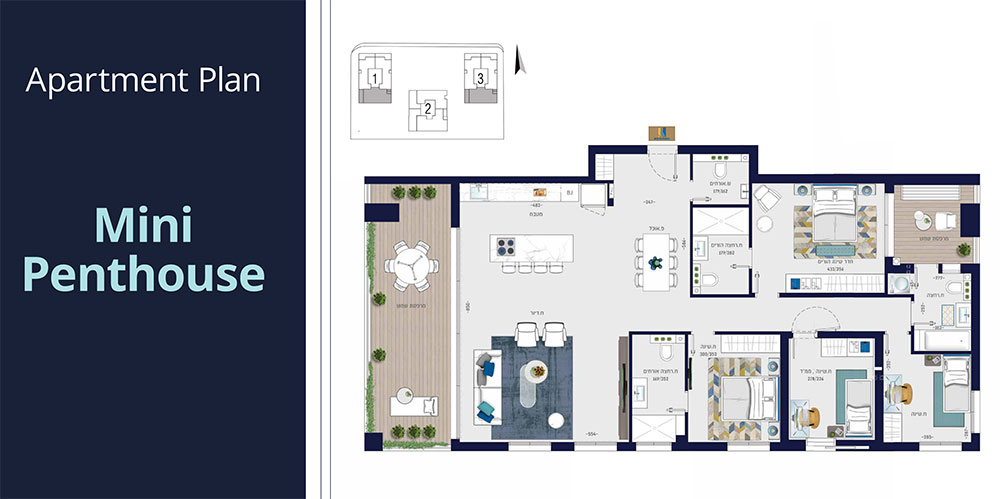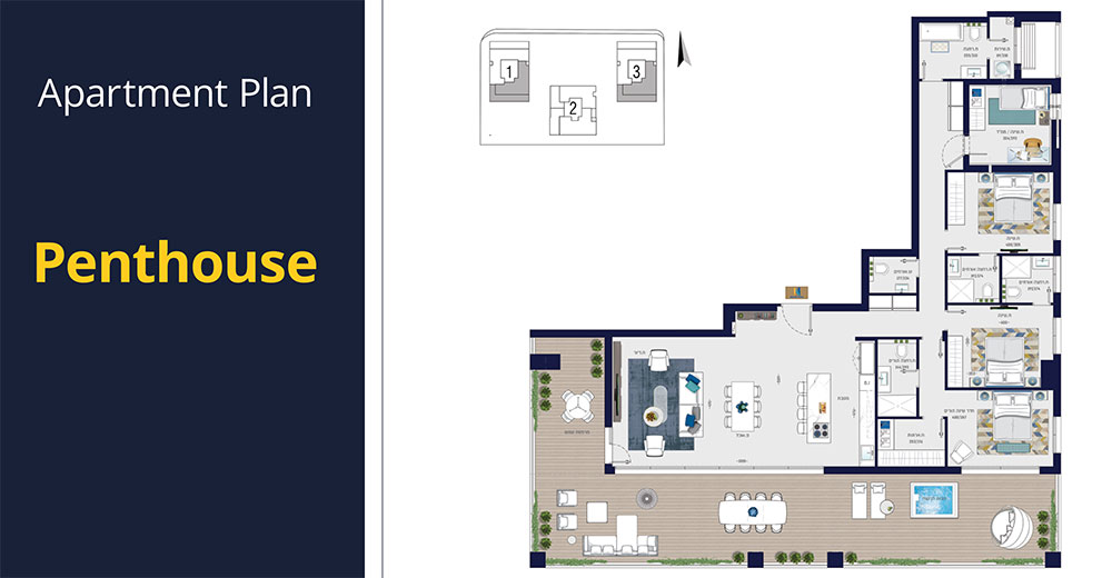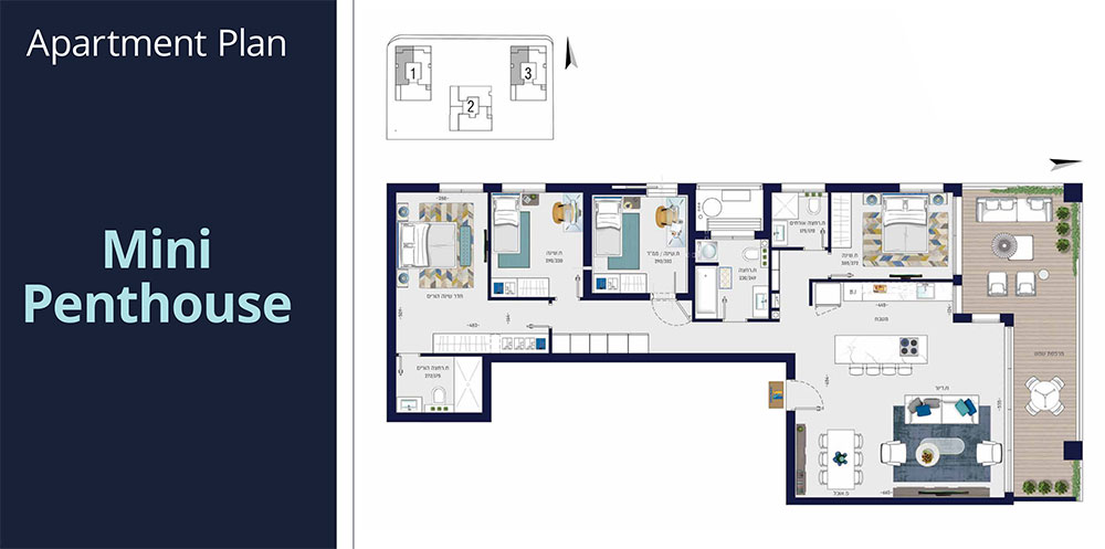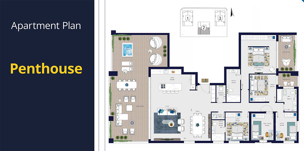 Apartment layouts, mini-penthouses, and penthouses.